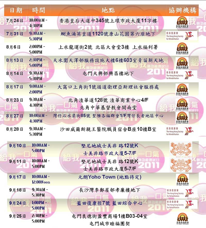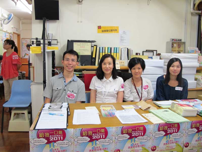2011年肺功能測試活動 “給我一口氣”經已順利完成。香港胸肺學會/香港胸肺基金會/美國胸肺學院(港澳分會) 在此感謝超過80名呼吸科醫生及護士的積極參與﹐於7月24日至9月25日期間﹐在港九新界各區舉辦了15次肺功能測試活動﹐接受評估的高風險市民超過1000名。所得數據將會於分析後公佈。以下為活動的圖片及出席活動的醫護人員名單﹕