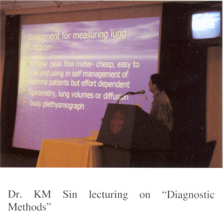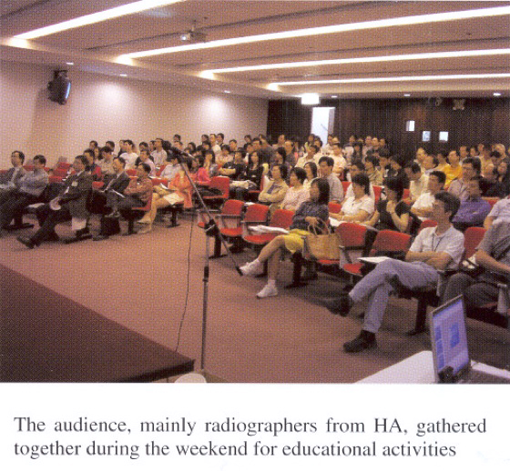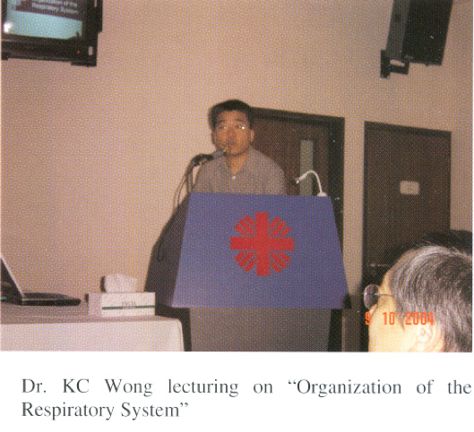 As part of the continuous medical education programme for medical and paramedical staff, the Hospital Authority has been organizing commissioned training programme for diagnostic radiographers annually. This year, the main theme of the activity was focused on the respiratory system. The Hong Kong Thoracic Society (HKTS) and American College of Chest Physicians (ACCP) (Hong Kong and Macau Chapter) had been invited to jointly organize the training programme this year, in collaboration with the Hospital Authority of Hong Kong SAR, at Caritas Medical Centre on 9-10 October, 2004. It consisted of a 2-day programme with topical presentations of major anatomical, physiological, pathological, clinical and radiological aspects of the respiratory system. Our council members Dr. David Hui (Presiden, HKTS) and Dr. PC Wong (Secretaryrrreasurer, ACCP (HK&M Chapter» conducted the opening and closing ceremonies, Dr. Wilson Yee (council member, HKTS) helped in organizing the event, while other members (Drs. KC Wong, James Ho, KM Sin, PY Tse, Fanny Ko, Raymond Liu) had contributed with their excellent presentations making the educational activity well received. The following are some of the shots taken during the event: