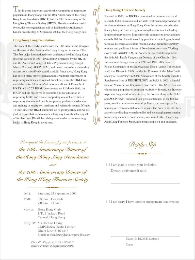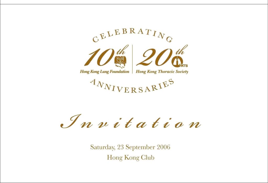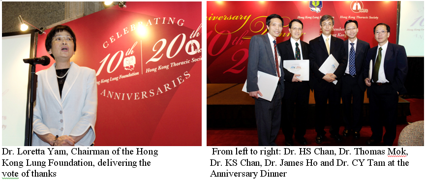 The Anniversary dinner to celebrate the 20th anniversary of the Hong Kong Thoracic Society and the 10th anniversary of the Hong Kong Lung Foundation was successfully held on September 23, 2006 (Saturday) at the Hong Kong Club.