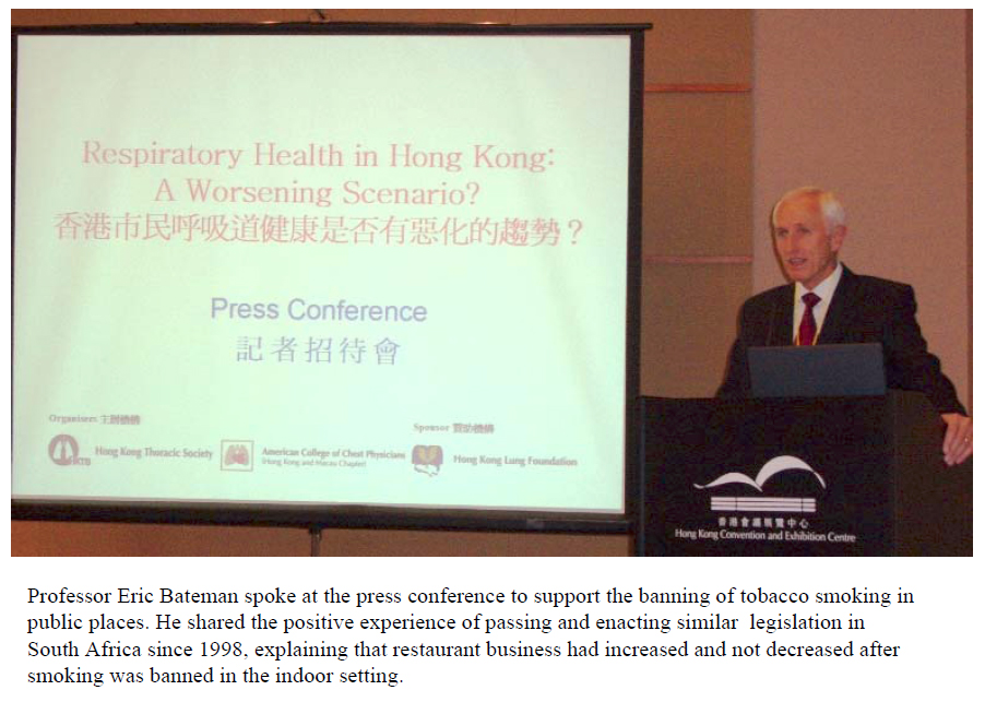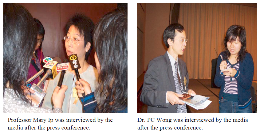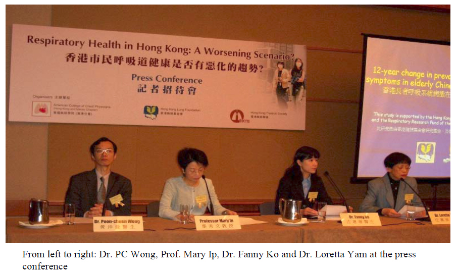 A press conference with the title “Respiratory Health in Hong Kong: a worsening scenario” was held on March 19, 2006 in the Hong Kong Convention and Exhibition Center. The press conference has attracted much media attention, and the messages of worsening respiratory health of people in Hong Kong, our Societies’ support for banning of tobacco smoking in public places and the need to improve air quality were clearly disseminated to the public.