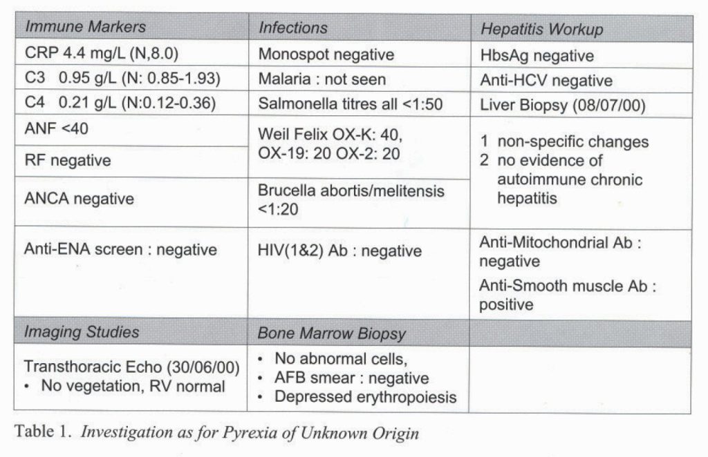 The patient was a 46 year old lady who was well until she presented to the Medical Unit of YCH in May 2000 when she complained of fever for 2 weeks. She noted chills and rigors and polyarthralgia involving both large joints and small joints of both hand. She had a facial rash but her GP ascribed it to drug allergy. She had a dry cough but was otherwise well. She had no history of travel. Physical examination at the initial admission was normal, except that aphthous ulcers were noted over the tongue and the proximal inter-phalangeal joints of both hands were slightly swollen. Initial work up showed that the patient had a normochromic normocytic anaemia with depressed reticulocyte count. There was a mild lymphopenia (lymphocytes 0.75x 109/L) and a raised ESR of 52 mm/hr. Biochemistry showed raised transaminases with an ALT of 307 U/L and AST of 283 U/L. The creatine kinase was also elevated at 389 U/L. The admission chest radiograph was entirely normal. Because of the persistent fever that was refractory to empirical treatment by Clarithromycin, workup as for pyrexia of unknown origin was started, as shown in Table 1.