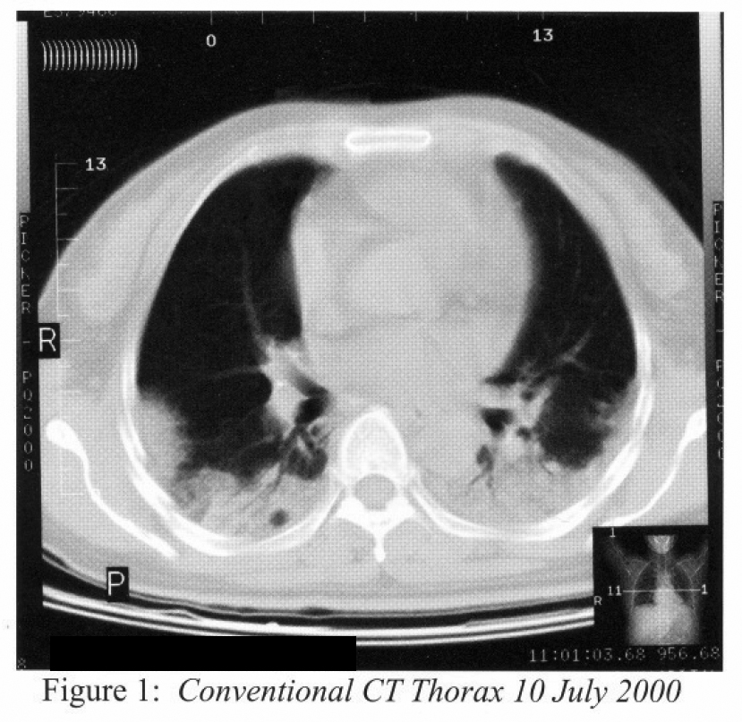 CT scan of Abdomen and Pelvis (28 June 2000) showed no abnormal lesions, no lymphadenopathy and only simple liver cysts. The CT thorax with intravenous contrast followed by HRCT Thorax in supine and prone positions were done on 28 June 2000. That showed subsegmental consolidation over both mid zones at lung periphery. The lower lobes showed parenchymal scarring with distorted architecture and bronchiectasis. There were no lymphadenopathy, no pleural effusion and no nodules. Features were non-specific, and was reported as: “Chronic changes with fibrosis and some acute lesion, Ddx: Interstitial Pneumonia, ? Early desquamative or usual interstitial pneumonia”