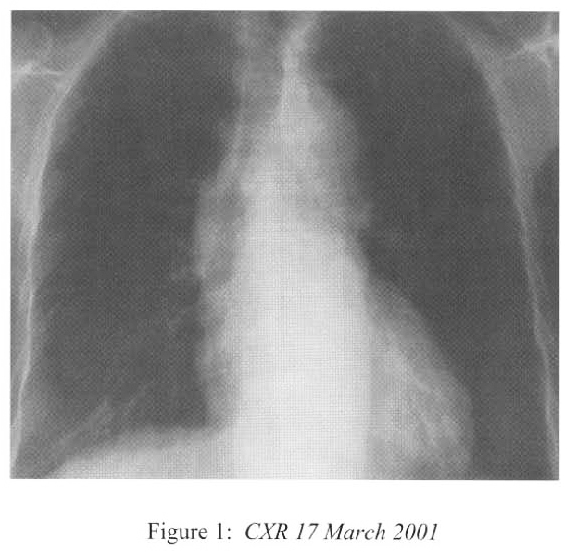 She was admitted to the medical ward on 17th March 2001 complaining of exertional dyspnoea, fever, chills and rigor. CXR showed right lower zone patch of consolidation (Figure 1) while baseline CXR in January 2001 was normal. She was treated with 1 week’s course of Ceftazidime. Steroid was continued while the cyclophosphamide was stopped. Fever resolved and the chest symptoms improved. However there was further deterioration of renal function in the next 10 days(creatinine 333–;>693 umol/L; creatinine clearance 8ml/minute). The clinical impression was progression to cresentic glomerulonephritis and she soon developed anuria before renal biopsy could be repeated and required peritoneal dialysis.