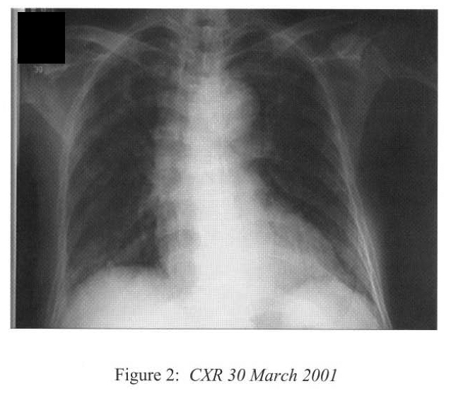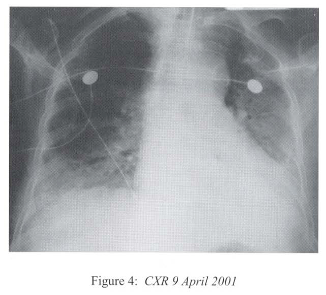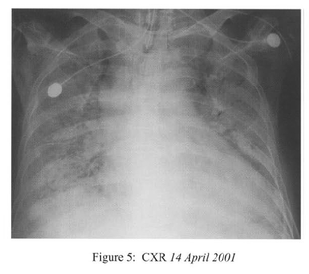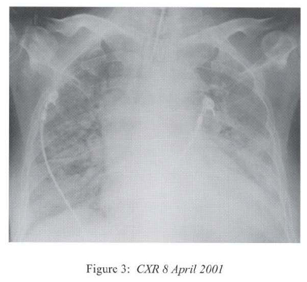 She deteriorated further on ih April 2001 with desaturation despite high flow oxygen. lCU admission was sought but there was no bed available. She was intubated and mechanically ventilated under sedation (midazolam infusion). CXR showed rapid deterioration to bilateral diffuse dense consolidation (Figure 3).
