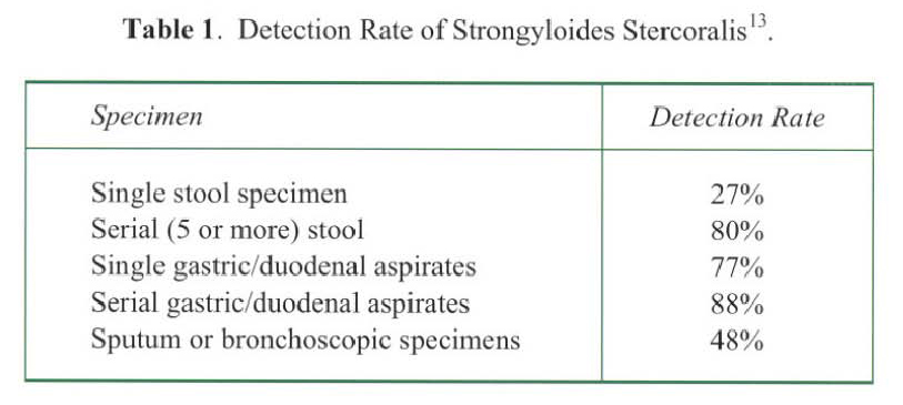 5. Lessnau KD, Can S, Talavera W. Disseminated Strongyloides stercoralis in human immunodeficiency virus-infected patients. Treatment failure and a review of the literature. Chest 1993; 104(1):119-122.