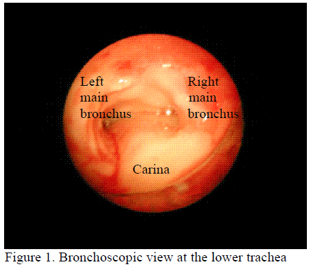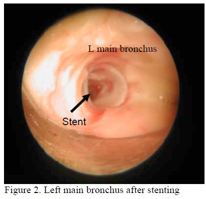 The patient was then referred to Clinical Oncology Unit of Queen Elizabeth Hospital at September 2005. The diagnosis was probable early lung cancer with mucosal lesion, without gross tumour. Since the lesions were not operable due to involvement of bilateral main airways, intraluminal brachytherapy was offered. The patient admitted again for increased shortness of breath three months after brachytherapy. Chest X ray was normal. Spirometry showed obstructive pattern with FEV1 decreased by 50%. Flexible bronchoscopy was done and found lower trachea and carina swollen and covered with whitish materials. The left main bronchus and right lower lobe bronchus were narrowed by mucosal swelling and covered with whitish materials. Bronchial aspirate for cancer cell and AFB by direct smear method were again both negative. Bronchial biopsy of left main bronchus showed fibrinoid material with scanty atypical cells only. The diagnosis of irradiation bronchitis was made after discussion with the oncologist in the Queen Elizabeth Hospital. Despite intravenous hydrocortisone 100mg Q6h, patient deteriorated with SaO2 90% on 100% oxygen via non-rebreathing mask. CXR showed partial collapse of the right upper and lower lobes. Rigid bronchoscopy was done and found stenosis of both left and right bronchi. Both main bronchi were dilated. Stenting was done for the left main bronchus as well.