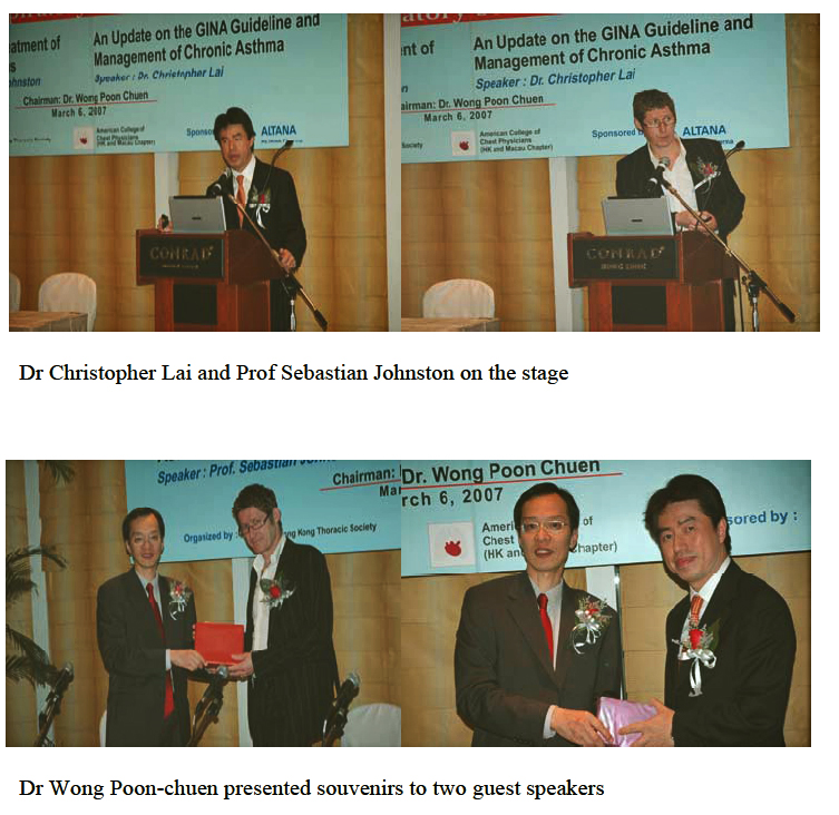 With the release of revised GINA guideline in late 2006, much attention has returned to a better management of asthma. The Hong Kong Thoracic Society and American College of Chest Physicians (Hong Kong and Macau Chapter) have timely arranged a special symposium to refresh and update colleagues about knowledge in this area. The symposium was held on 6 March 2007 at Conrad Hotel. Our audience was very privileged to have two distinguished speakers delivering informative and enlightening talks in that evening. The first talk on “Pathogenesis and treatment of asthma exacerbations” was given by Prof Sebastian Johnston from UK. It was immediately followed by our local expert, Dr Christopher Lai, with a talk on “An update on the GINA guideline and management of chronic asthma”. The symposium ended with a “Q & A” section between the two experts and the audience.