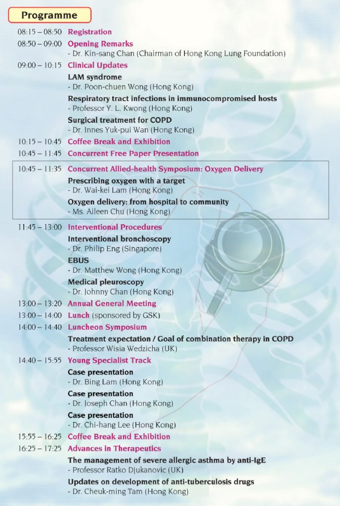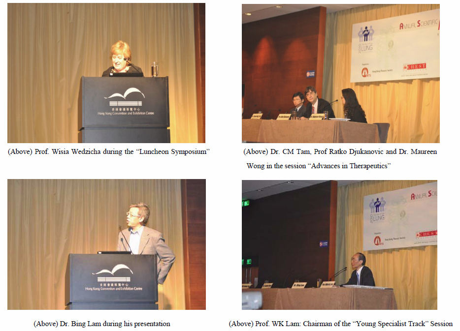 The opening remarks of Dr. KS Chan, Chairman of Hong Kong Lung Foundation, centred around the theme of “Year of the Lung” in the current year. That was followed by the session of “Clinical Updates” where advances in the areas of lymphangioleiomyomatosis, respiratory infections in immuno-compromised hosts and surgical treatment for COPD were delivered by Dr. PC Wong, Prof. YL Kwong and Dr. Innes Wan respectively. A special “Asthma Forum” followed, which was chaired by Dr. Christopher Lai, and joined by a distinguished panel of local and international experts with Dr. Daniel Ng, Dr. Fanny Ko, Prof. Ratko Djukanovic and Prof. Wisia Wedzicha. The forum was organized to critically evaluate the recent FDA’s recommendations on the use of LABAs in asthma based on existing evidence. The concurrent “Allied-health Symposium” focused on “Oxygen Delivery” with lectures delivered by Dr. Wai-Kei Lam and Ms. Aileen Chu. The following session was “Interventional Procedures”, with updated reviews in interventional bronchoscopy, EBUS and pleuroscopy, and being addressed by Drs. Philip Eng, Matthew Wong and Johnny Chan respectively. The theme of the “Luncheon Symposium” was on the treatment goals of combination therapy in COPD, which was delivered by the world-renowned expert of COPD, Prof. Wisia Wedzicha. The “Young Specialist Track” followed, with excellent case presentations from Drs. Bing Lam, Joseph Chan and CH Lee, covering areas of carcinoma of bronchus, hypersensitivity pneumonitis due to Penicllium and extra-medullary erythropoesis presenting as intra-thoracic masses respectively. The last, but certainly not the least important, session of the day was dedicated to “Advances in Therapeutics”, when Prof. Djukanovic and Dr. CM Tam shared with us the exciting news in the areas of anti-IgE treatment in asthma and development of new anti-tuberculous drugs.