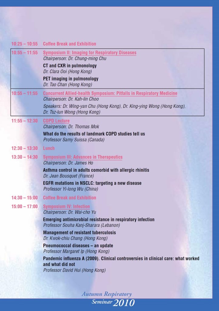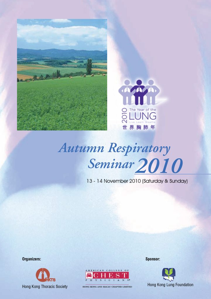 These included H1N1 influenza in China, MRSA, antibiotic resistance, antibiotic stewardship, ventilator-associated pneumonia and the role of pleuroscopy in pleural infections. The following whole-day program, being held in Hong Kong Convention and Exhibition Centre, began with a “Critical Care Symposium” that brought us important updates on use of ECMO in H1N1 infection and sedation towards weaning from mechanical ventilation. That was followed by 2 concurrent symposiums, namely “Imaging for Respiratory Diseases” and an Allied-health Symposium on “Pitfalls in Respiratory Medicine”. A COPD lecture immediately followed, which instilled participants with new insights from the recent landmark COPD studies. The afternoon symposium of “Advances in Therapeutics” updated us on the management of adult asthma with allergic rhinitis and the role of EGFR mutations in non-small cell lung cancer. The 2010 ARS was concluded with a symposium on “Infection”, covering antimicrobial resistance in respiratory infections, drug-resistant tuberculosis, pneumococcal diseases and the clinical controversies in managing the pandemic influenza A of 2009.