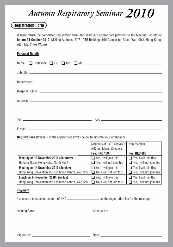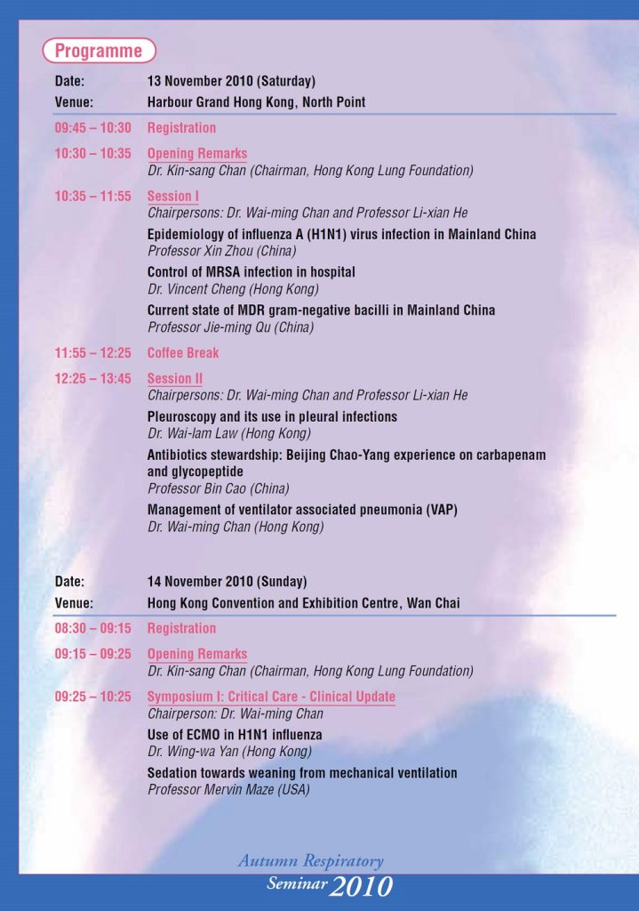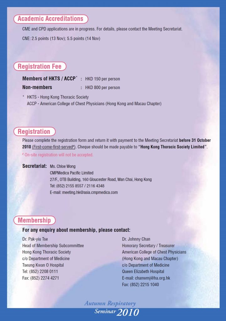 Please be informed that the Autumn Respiratory Seminar this year will be held on 13 – 14 Nov. It will be a 1.5 days meeting this year. The first day (13 Nov) will be held at the Harbour Grand Hong Kong in North Point while the second day (14 Nov) will be held at the Hong Kong Convention and Exhibition Centre.