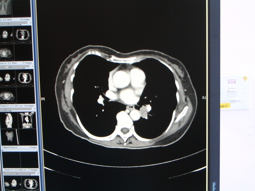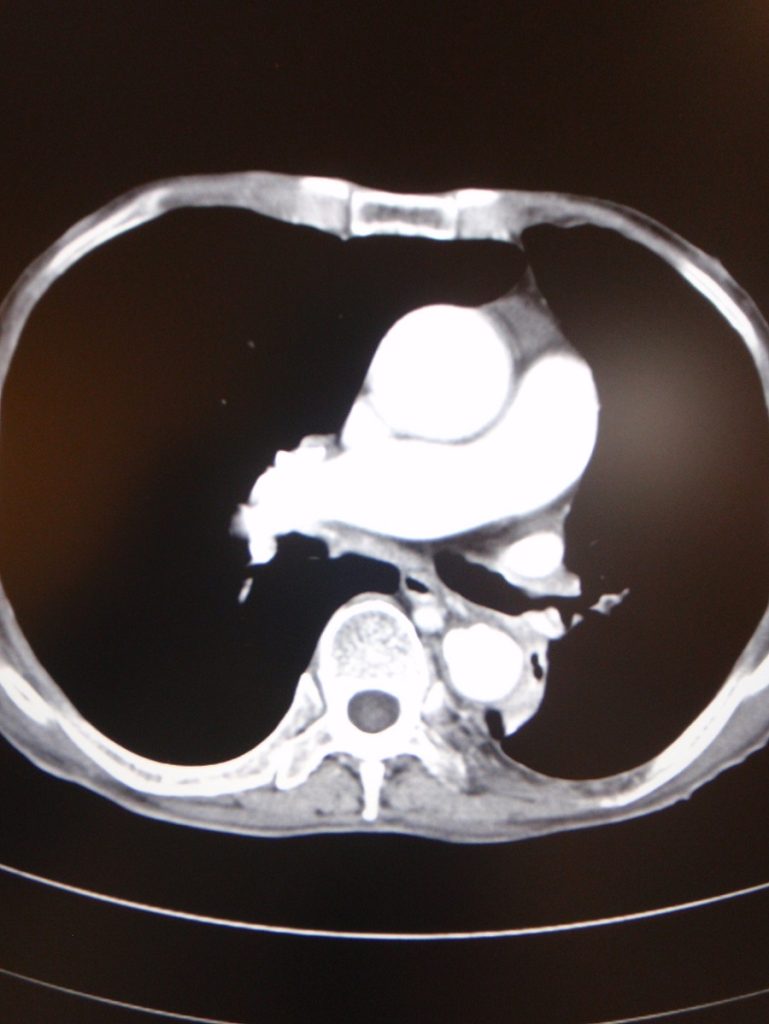 Fig.2 (Above) Patient 1: Computerized tomogram of thorax on 6 April 2010 showed an enhancing lesion at left infrahilar region measuring 1.5 x 2.3 x 2.5 cm in LLL with erosion into LLL bronchus.